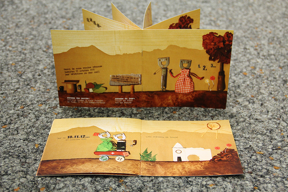 Création d’un faire-part de mariage sous forme de petit livret. La date de l’événement étant le 10.11.12, la petite histoire avait son fil conducteur…