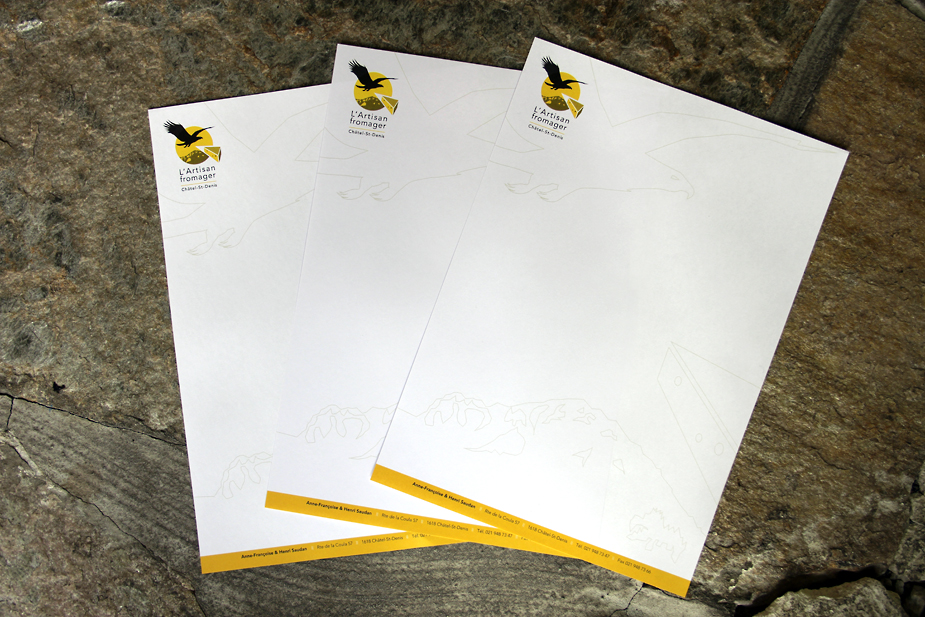 Conception des entêtes de lettre de la fromagerie en intégrant en filigrane les éléments graphiques du logo.